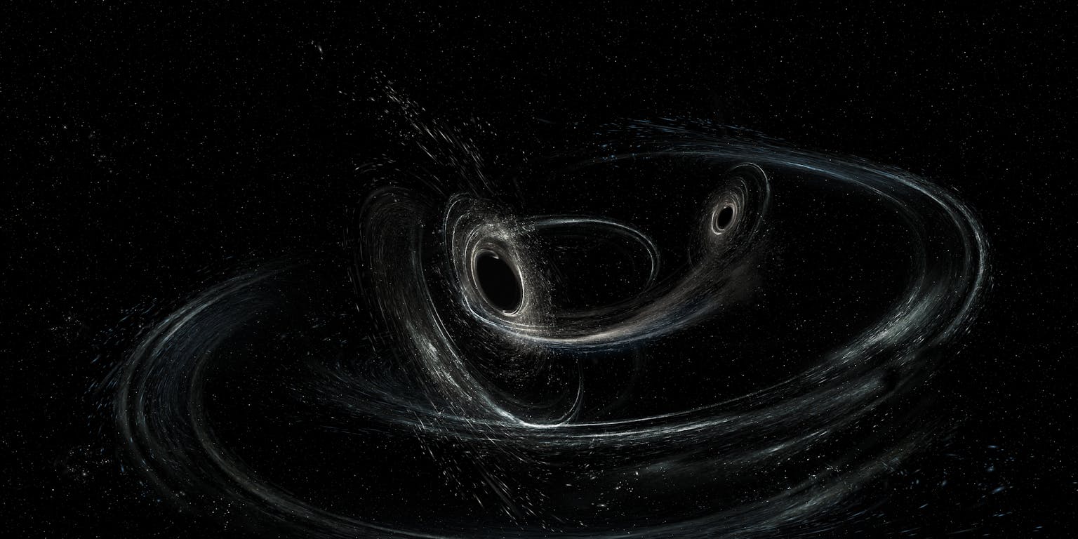 Impressie van twee zwarte gaten die om elkaar heen draaien.